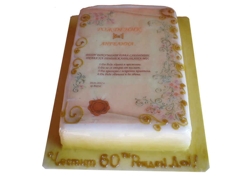 Торта грамота. Украса от захарно тесто, в зависимост от празника Ви – различно съдържание.